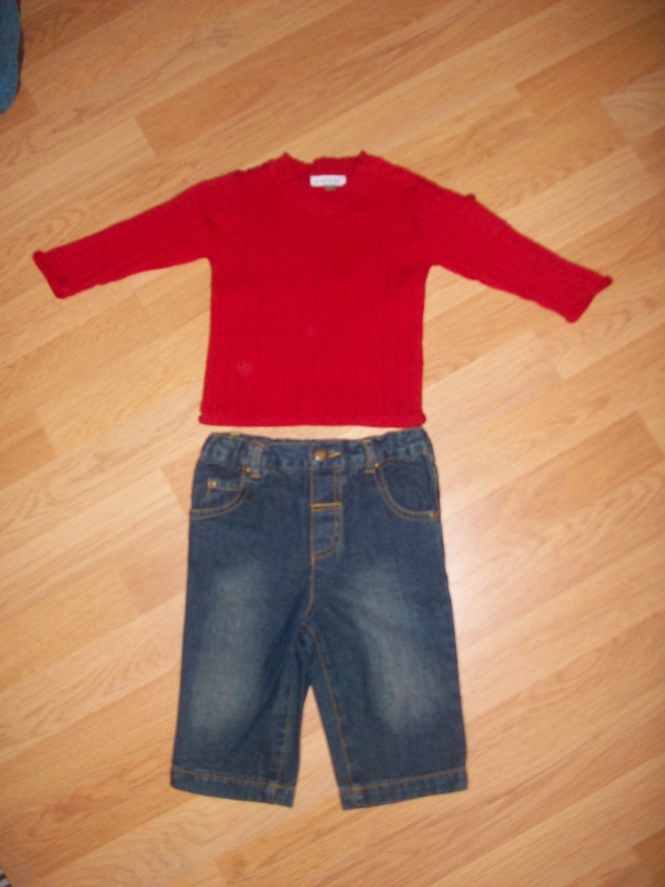 Ensemble jean et pull coll V rouge, bord des manches légèrement roulé pour donner un effet. Peuvent être vendu séparément. Les deux articles sont neufs.